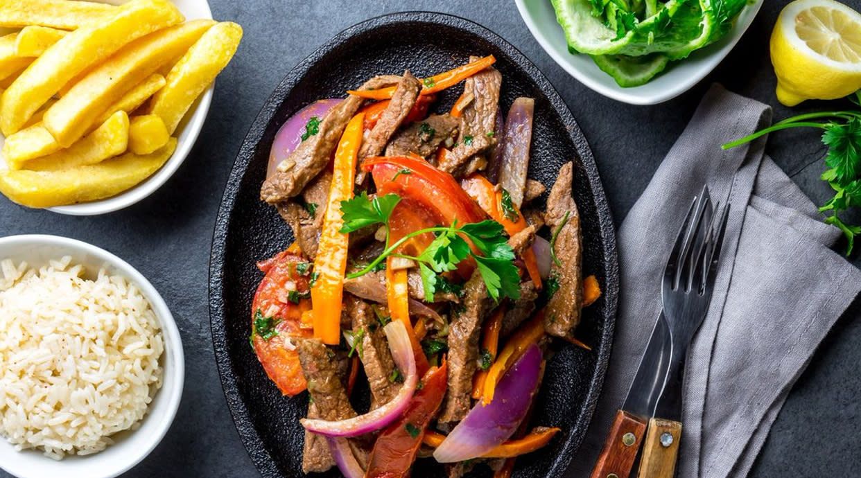 Trozos de corazón de res flameados al wok acompañado de patatas doradas y ají de la casa