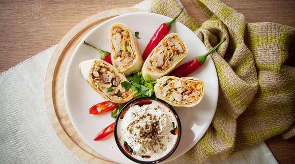 Pan tortilla, carne de pollo, queso, ensalada y salsa