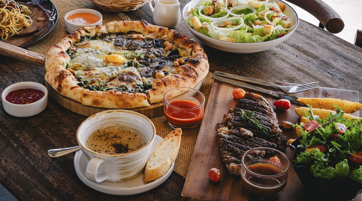 Alcachofas, tomate, albahaca, champiñones, jamón o salami y aceitunas