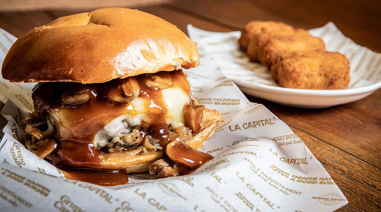 Pan brioix rojo , cebolla caramelizada, champiñón salteado, queso cheddar havarti, lechuga y salsa Canalla.