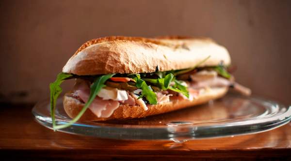 Pan cortado a la mitad relleno de anchoas