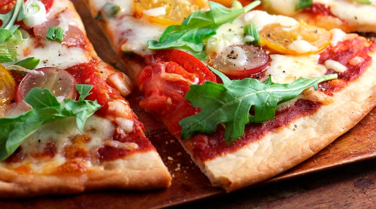 Jamón de parma, mozzarella de búfala, tomate cherry, rúcula y orégano