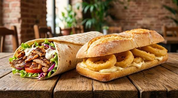 Trozos de pollo cocinado al estilo kebab, envuelto en pan de durum. Salsa casera especial de ajo, salsa casera especial de tomate, lechuga, pepinillo agridulce, tomate y cebolla roja