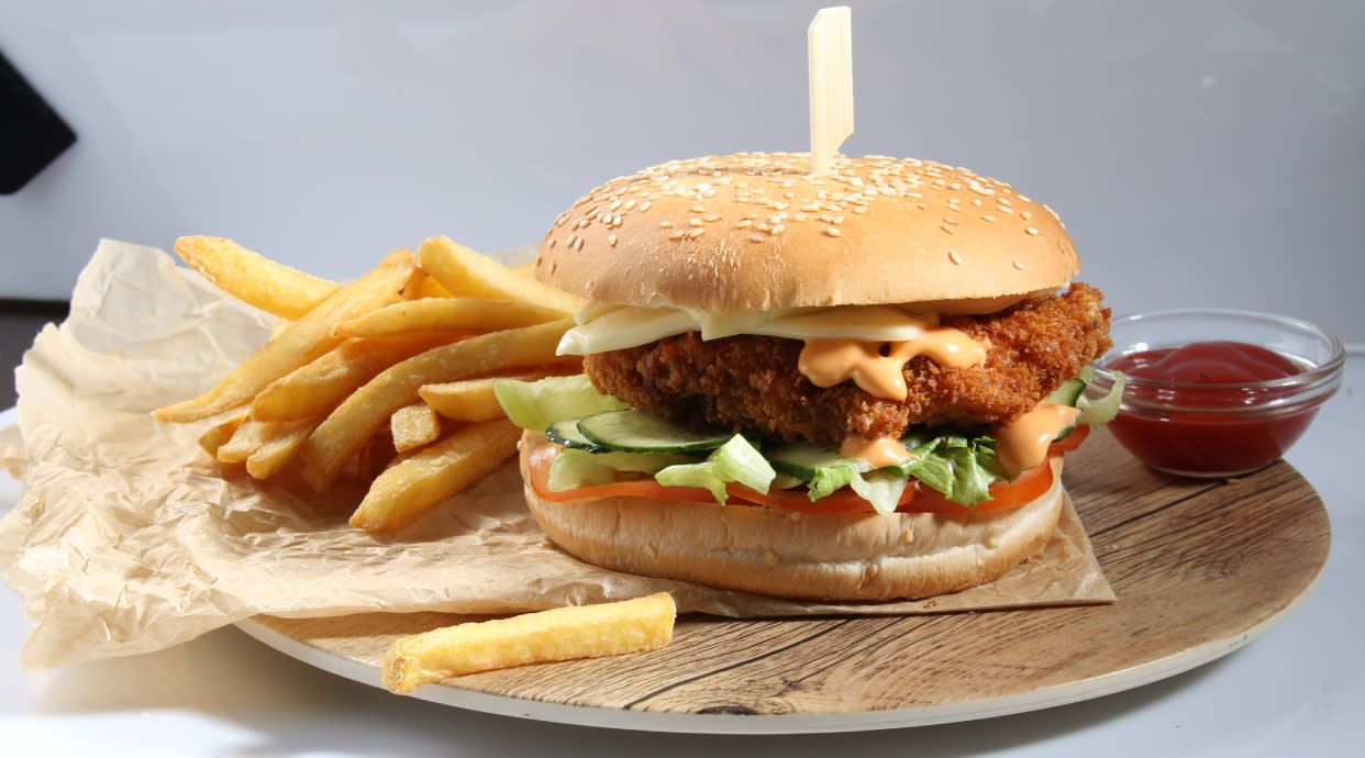 Carne mixta (120 g.) de vacuno y cerdo, lechuga, tomate, cebolla natural, queso Gouda, jamón, bacon, lomo, huevo, kétchup, mayonesa y mostaza