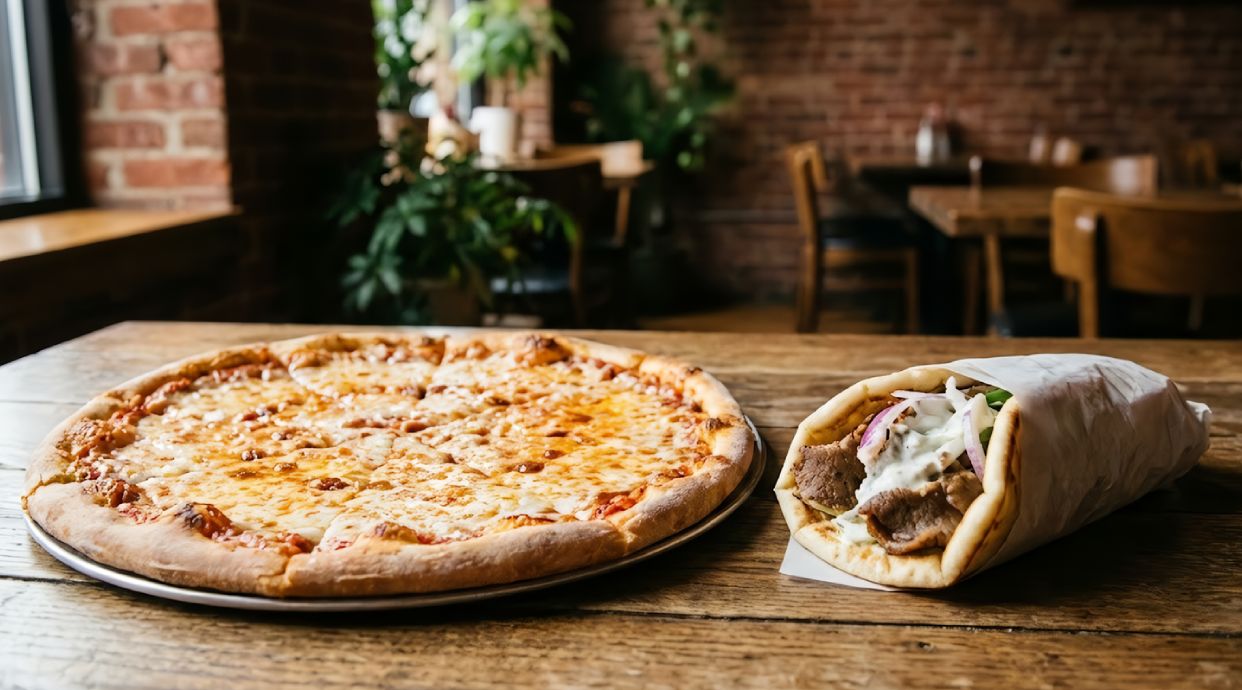 Salsa de tomate, queso, carne picada, cebolla roja, pimiento rojo y salsa de taco