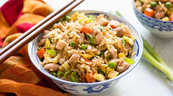 Arroz con trozos de calamares, pollo, cebolla frita y salsa de soja.