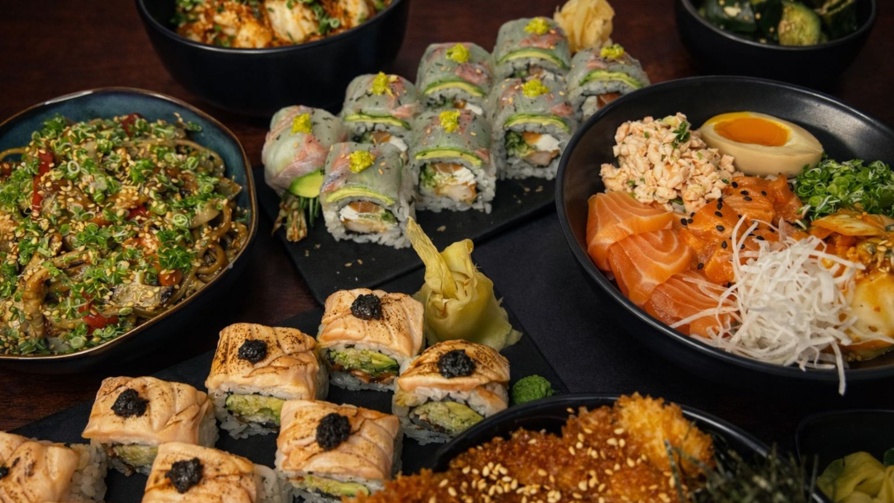 ორთქლზე მომზადეებული ბრინჯი, ორაგული, ცხარე ორაგული, დამარინადებული კვერცხი, კიმჩი, ვასაბი, ჯინჯერი, მწ.ხახვი