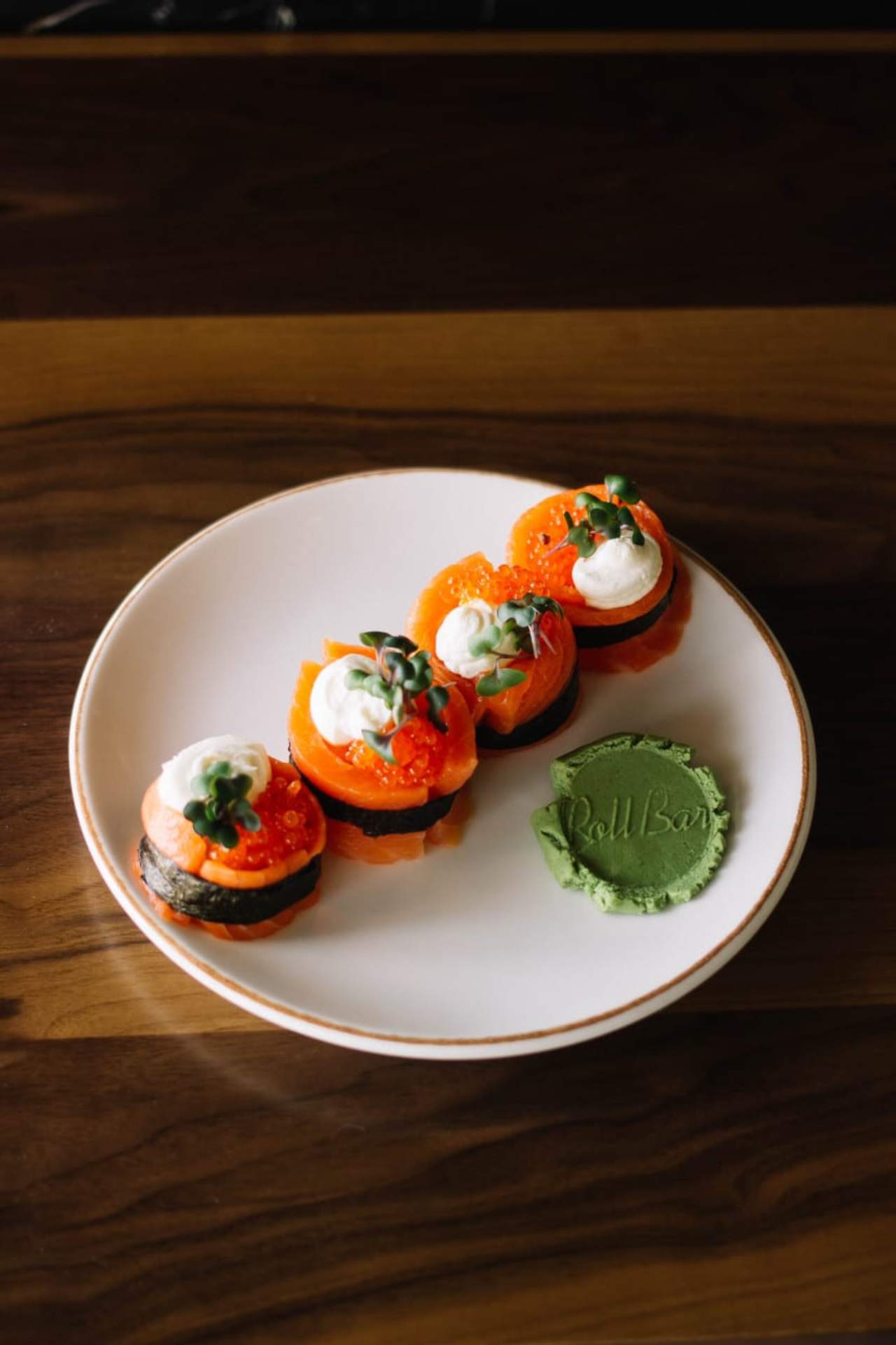 Rice, nori, tuna, salmon, cream cheese, cucumber, squid ink, tobiko caviar 8 pieces