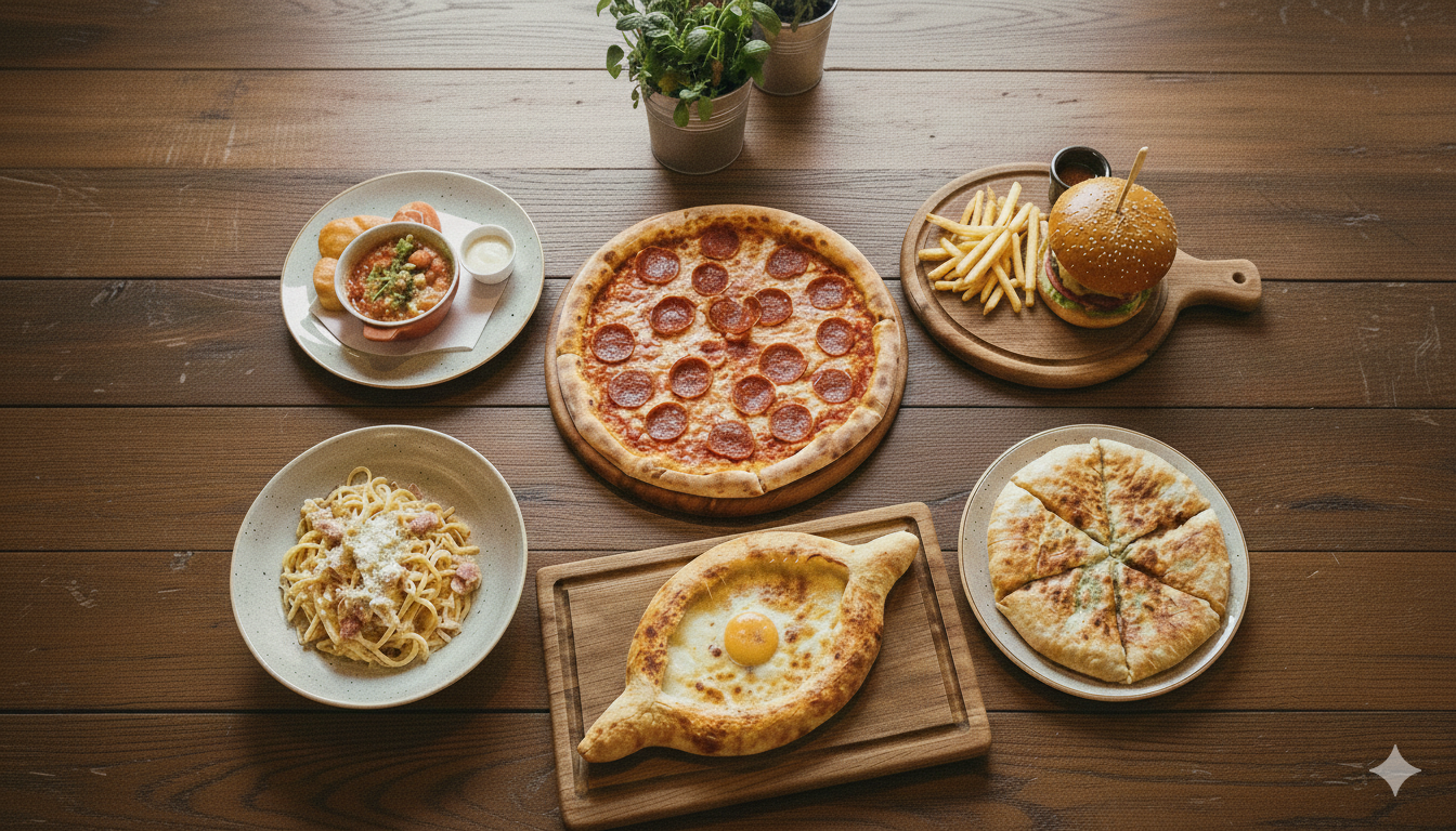 კიტრი, პომიდორი, სულგუნი, მწვანილები, მაიონეზი