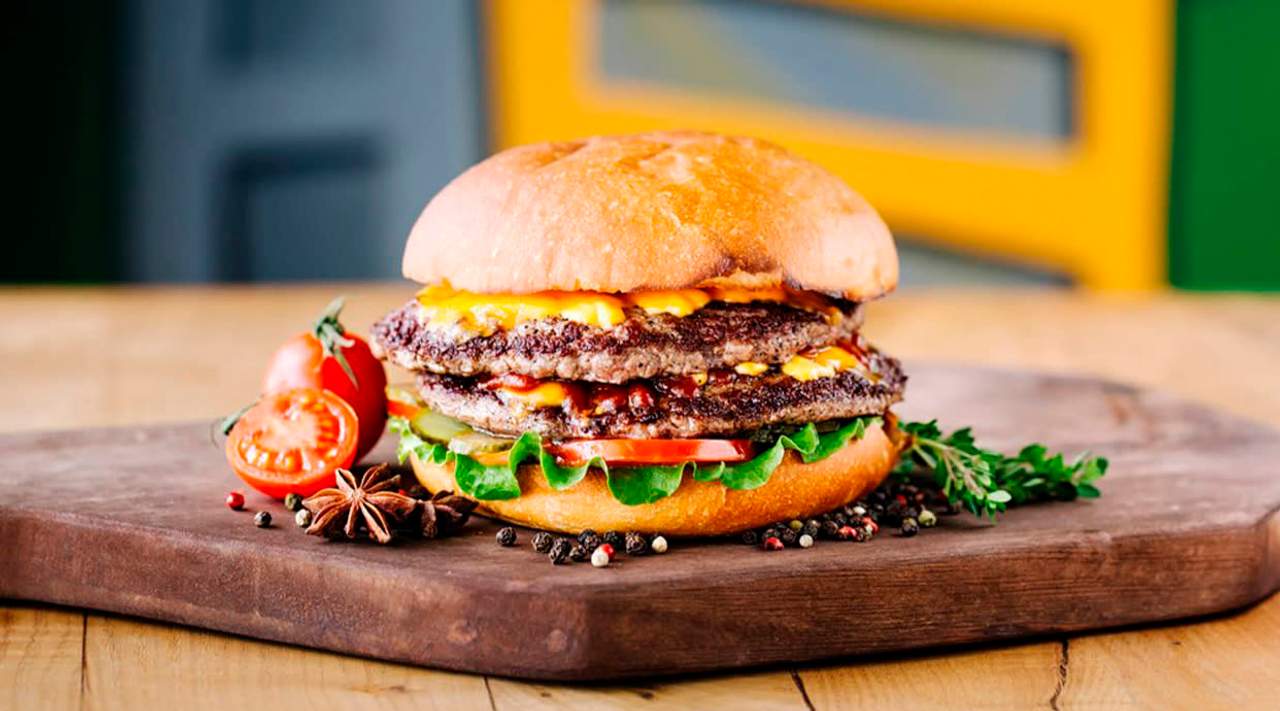 კატლეტი საქონლის ხორცით,სალათი “აიზბერგი”,კიტრის მარინადი, პომიდორი, ყველი ჩედარი,სოუსი, ბეკონი