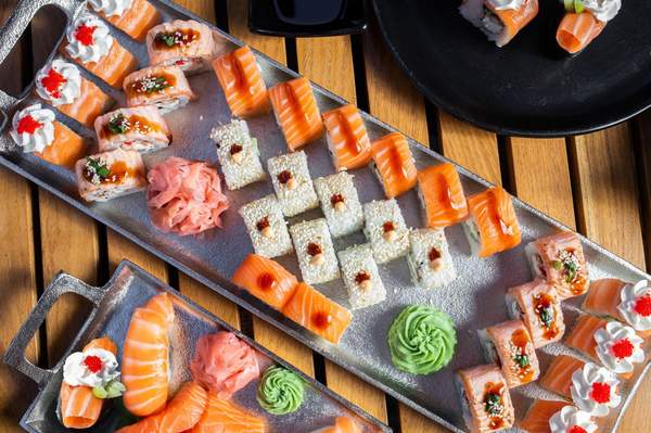 ნორი, ბრინჯი, ორაგული, სრირაჩა, კიტრი, ავოკადო, უნაგის სოუსი