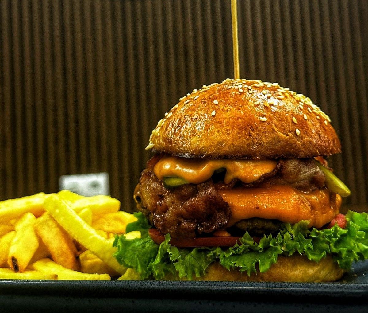 Our burger bun, Chef's sauce, one beef patty, lettuce leaf, pickled cucumber, tomato, cheddar, french Fries, Ketchup, Coca-Cola