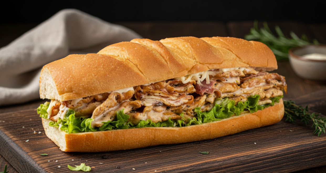 ბაგეტი, დამარინადებული ქათამი, მაიონეზი, სალათის ფურცელი და ჩედარის ყველი