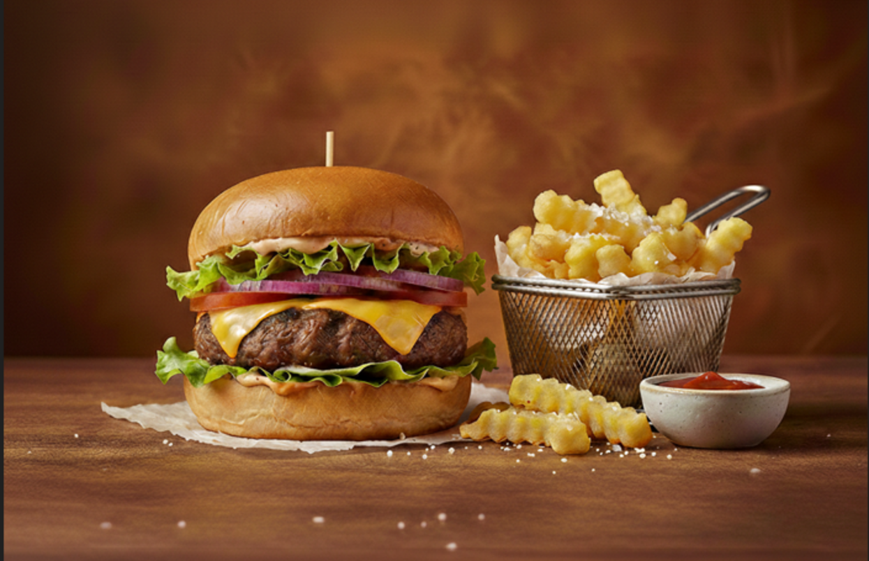 ხორცი 200გრ, ბეკონი, ჩედარის ფირფიტები, კიტრის მწნილი, ბარბექიუს სოუსი, ჰოლანდიური სოუსი, აისბერგი