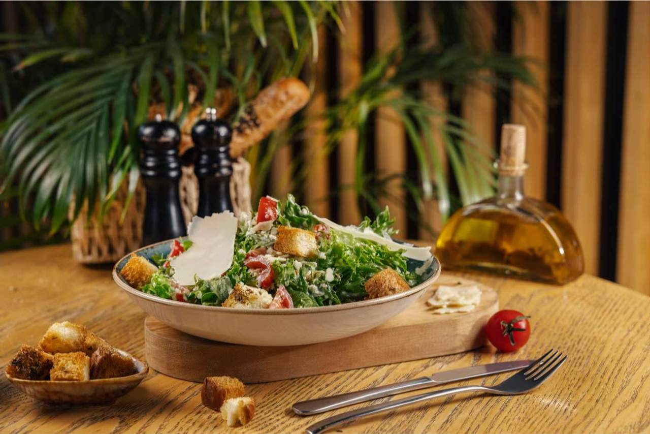 სალათის ფურცელი, შემწვარი ქათამი, პარმეზანი.