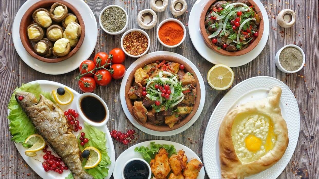 ღორის კარეიკა, სოკო სულგუნით, კარტოფილი, ხბოს ჯიგარი, სულგუნის ფირფიტები, კიტრი, პომიდორი