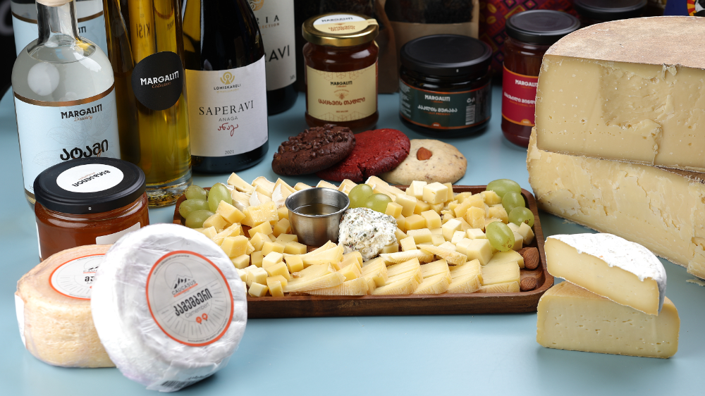 სასალათე ყველი , მუჩლი , რაკლეტი , კამემბერი , დამწიფებული მთის ყველი , თაფლი , ჩირი , ყურძენი , თხილი