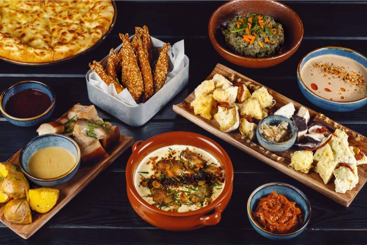 პრასის ფხალი, წითელი ბულგარული, მწვანე ლობიო, ჭარხალი ალუბლის ტაპენადეთი, ნიგვზიანი ბადრიჯანი და ისპანახის ფხალი მჭადის ჩიფსით