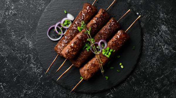 ხბოს ხორცი, სომხური ლავავაში, წითელი ხახვი, ბროწეული, საწებელი, ნახშირი.