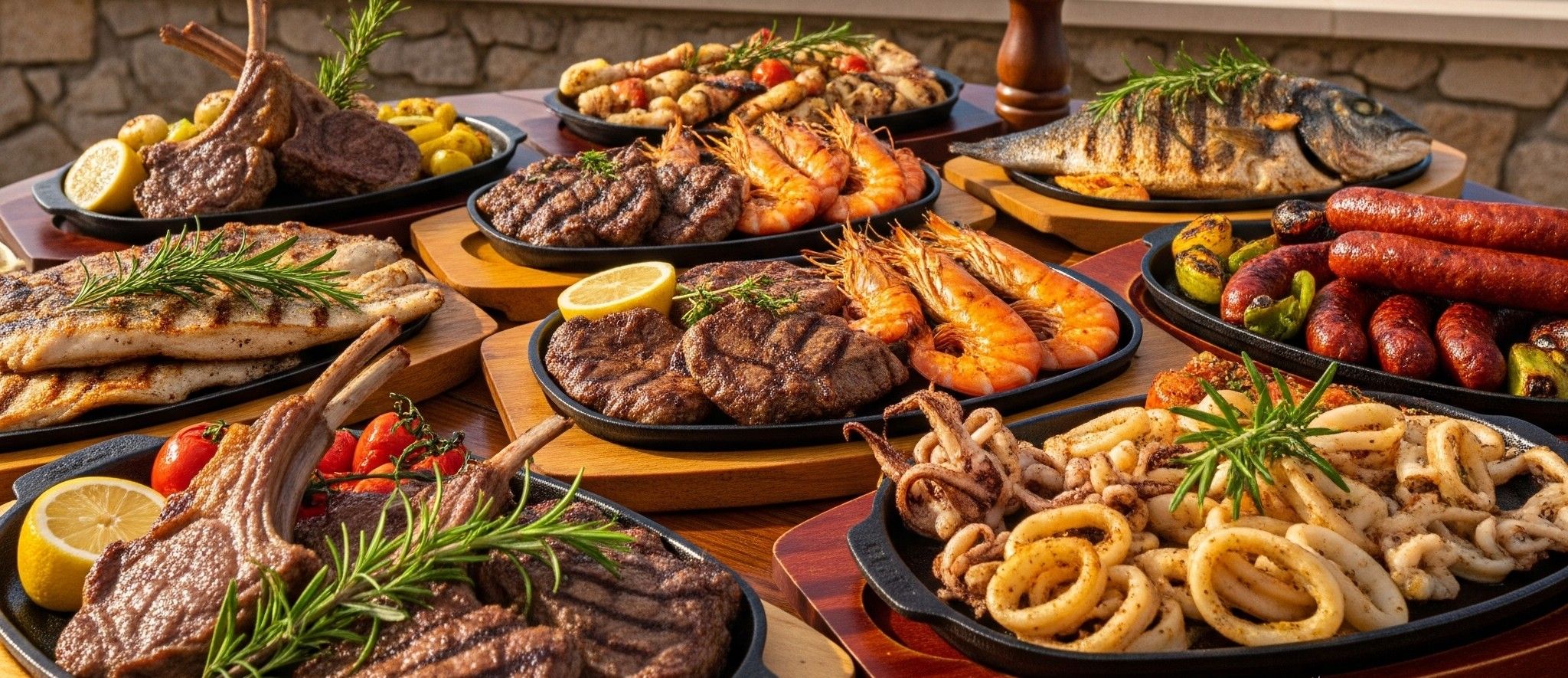 2 gurmanske plјeskavice, 8 ćevapa, pileći vrat, punjeni batak/zabatak, 4 mesna uštipca, 4 domaće kobasice, punjena svinjska vješalica, povrće žar, ploške krumpira, kajmak, ajvar, kapula, urnebes, pogačica