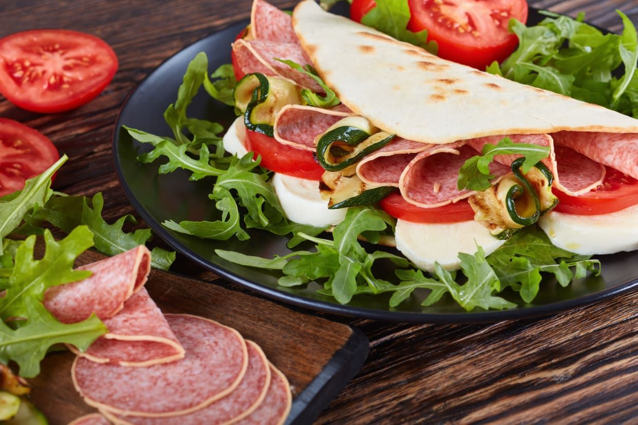 Fesa di tacchino, fontina, pomodoro fresco e rucola