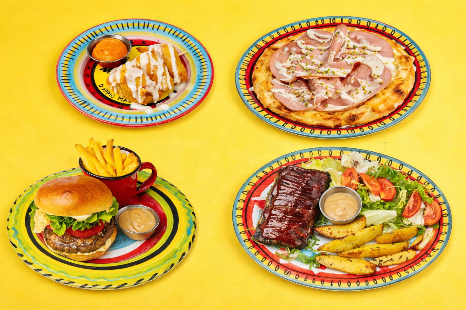 Hamburger di manzo*, mortadella di Bologna IGP, stracciatella di burrata, pomodoro ramato e insalata gentile