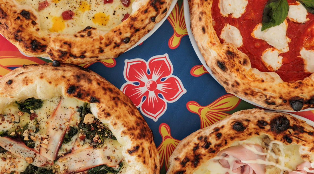 Pizza Ripiena con ricotta ,Fiordilatte di Agerola. Fuori forno : Pomodorini rossi semidried e gialli Giagi, Songino, prosciutto crudo di Parma Ponte Romano 24 mesi e scaglie di Parmigiano Reggiano 24 mesi DOP