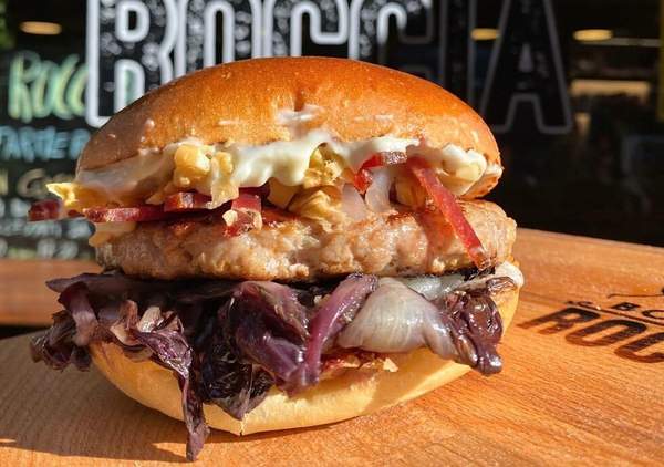 Hamburger 180g di suino, burrata pugliese, pomodori secchi, rucola e pancetta tesa