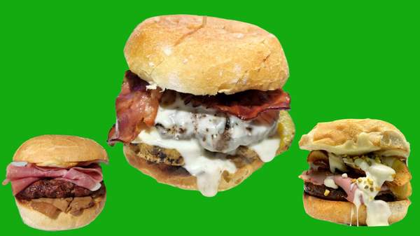 Panino con hamburger da 150 g, bacon, cheddar, cipolla caramellata, salsa barbecue, patate chips