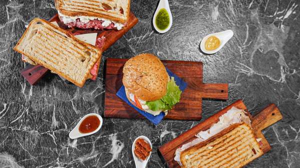 Pane hamburger con bra, toma, zucchine, pomodoro e salsa yogurt