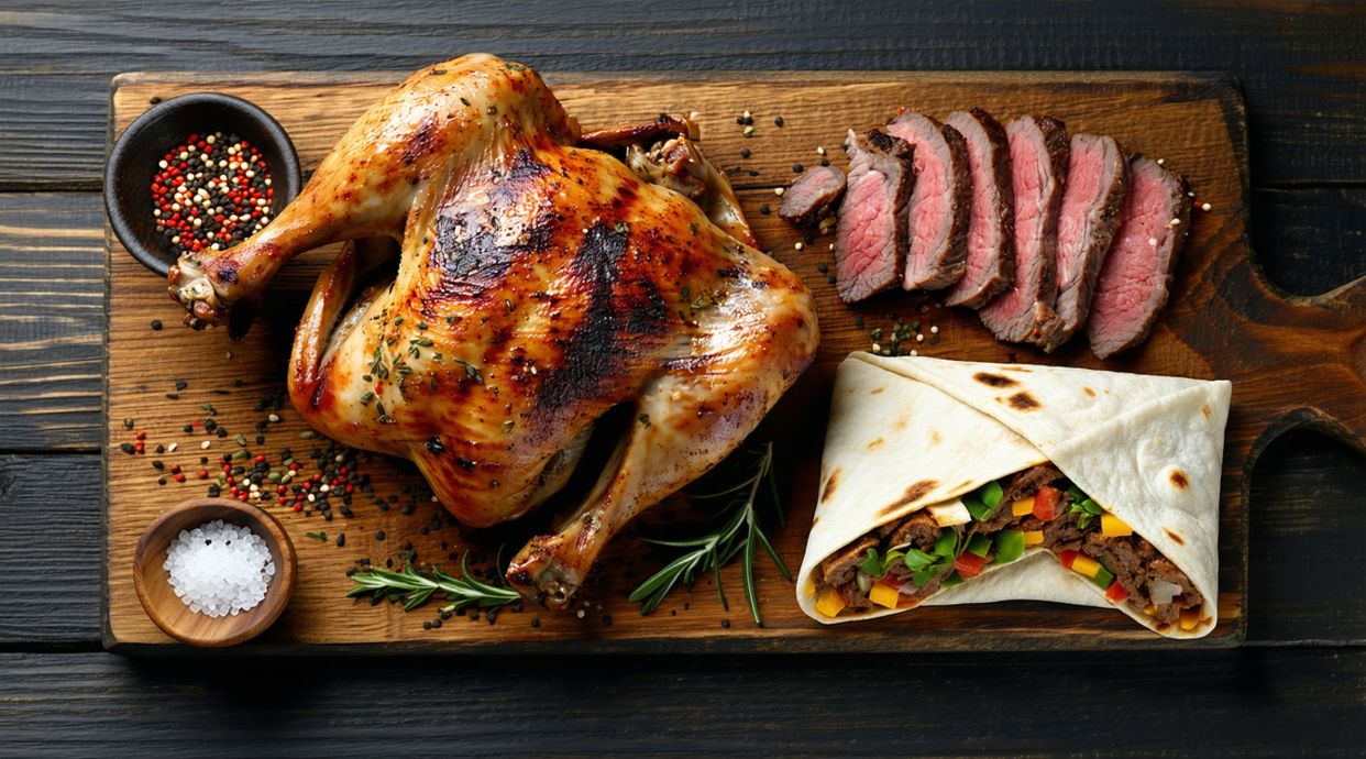 Tender slices of seasoned meat wrapped in soft flatbread with garlic sauce, vegetables, and tahini.