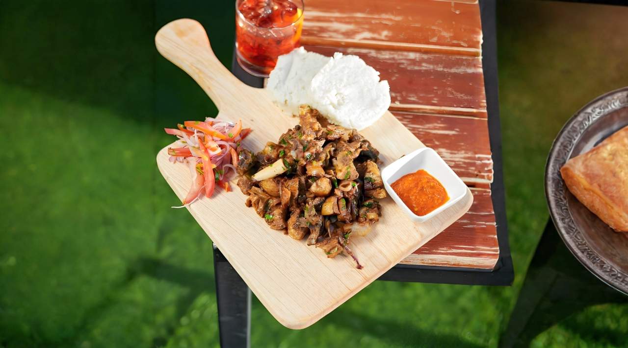 Mbuzi wet fry, succulent goat meat simmered in a flavorful sauce, delivering a juicy and tender taste.
