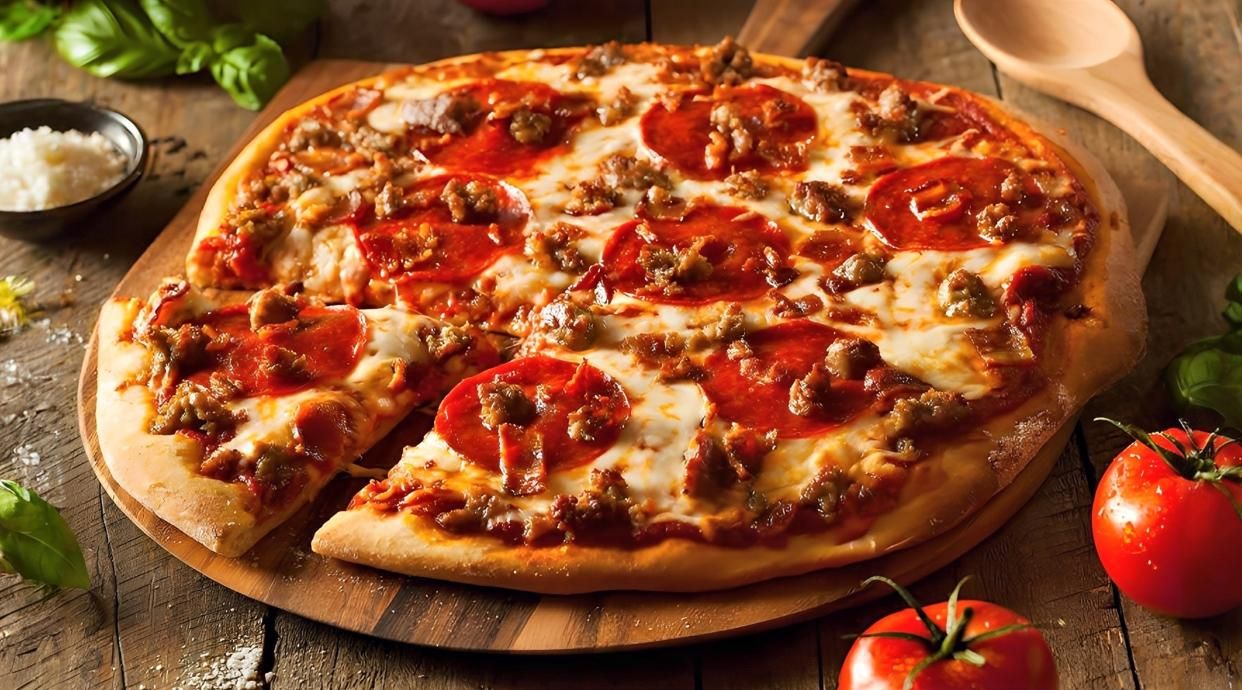 Тесто, Пепперони, сыр Моцарелла, красный соус,