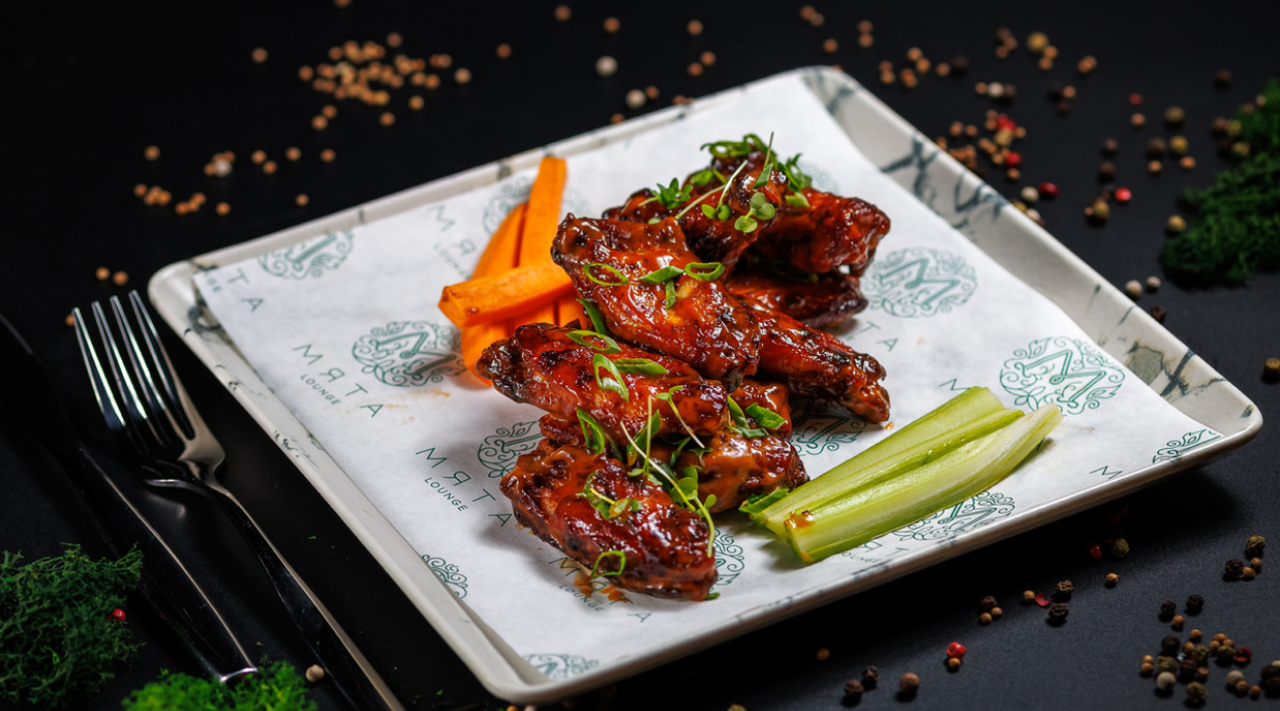 Крылья, соус Кисло-сладкий, сельдерей, морковь, лук зеленый