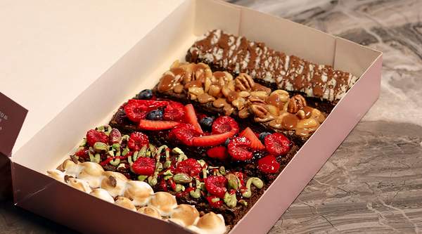 Brownie fondant garni d'une couche de crème de lotus et de biscuit au lotus