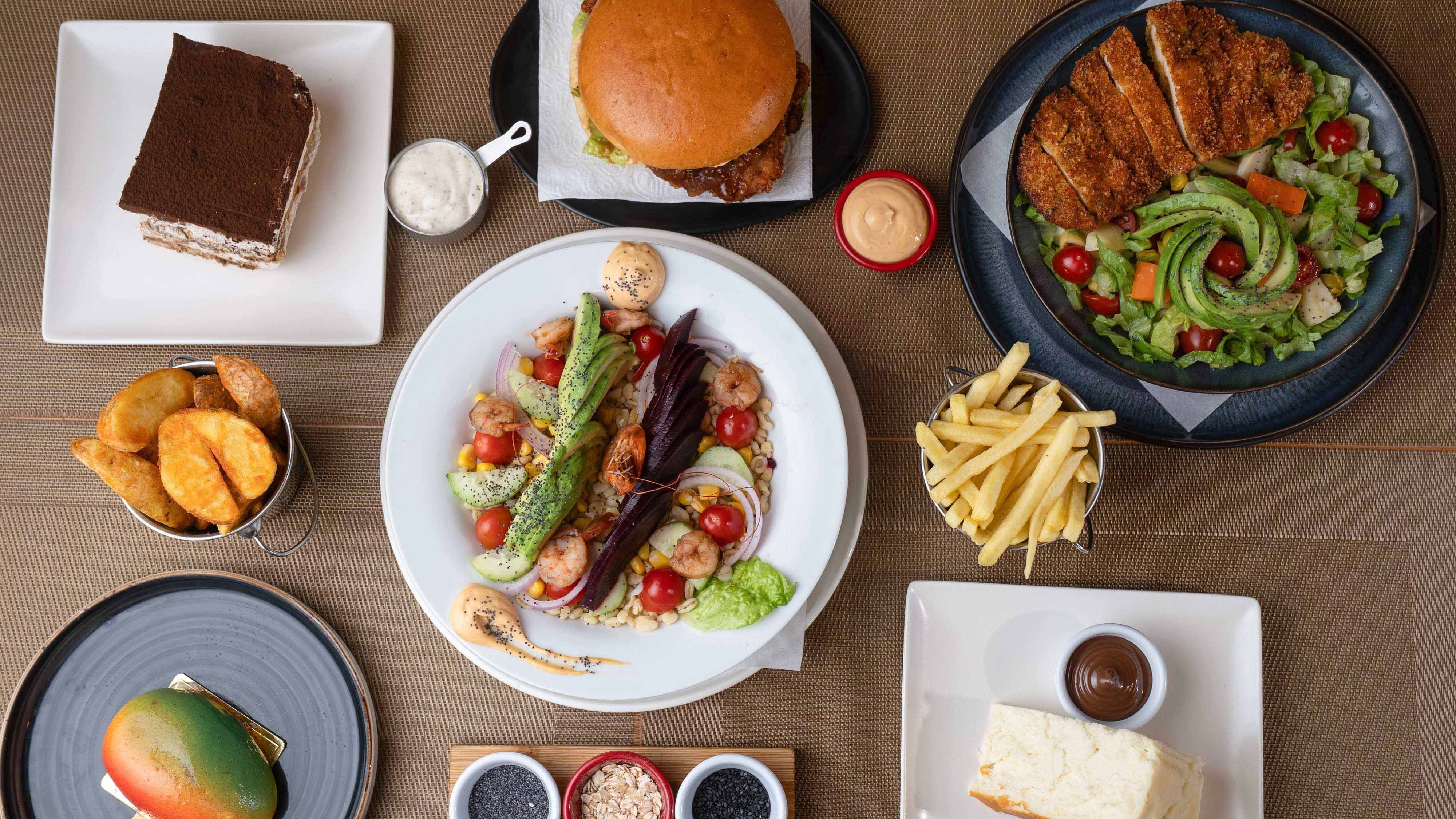 Viande hachée, fromage cheddar, laitue, cornichons, olives, oignons, tomate, sauce cocktail