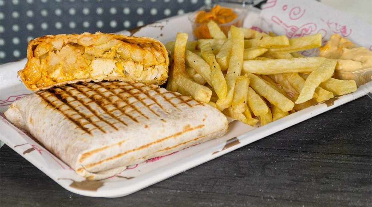 Frites, viande hachée, poulet, sauce blanche, fromage