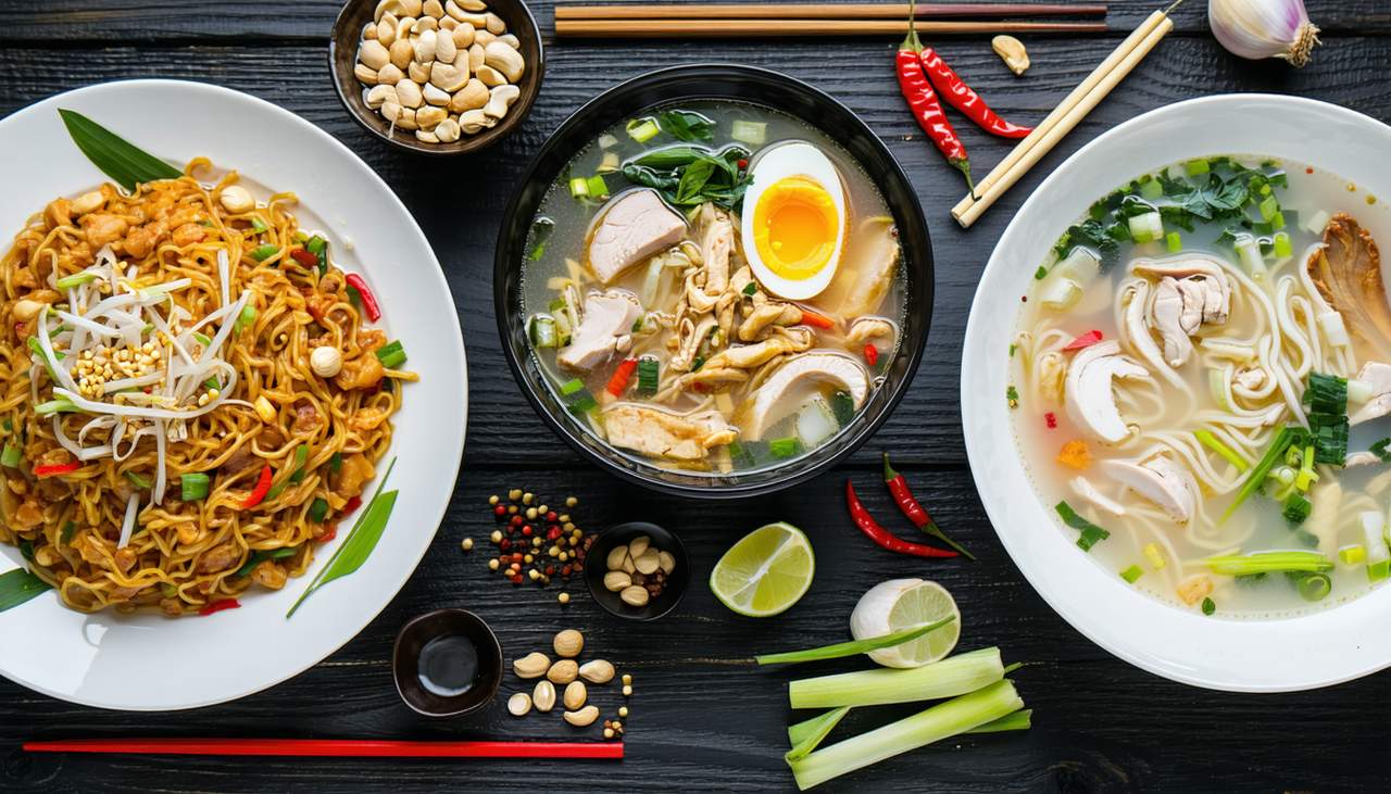 Smażony makaron ryżowy, kurczak, jajko, kiełki fasoli mung, warzywa, orzeszki ziemne, sos na bazie owoców tamaryndowca i miodu