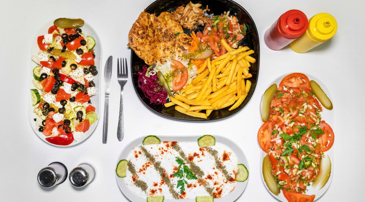 Bułka, mięso, surówki, sos