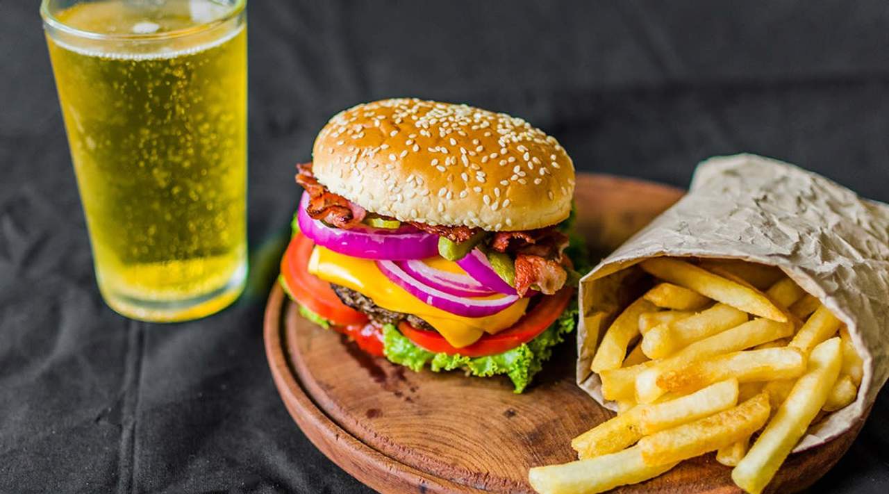 200g wołowiny, bułka maślana, ser cheddar, pomidor, ogórek piklowany, cebula karmelizowana, sałata, bekon grillowany, sos aioli, sos bbq, frytki, steakhouse, sałatka