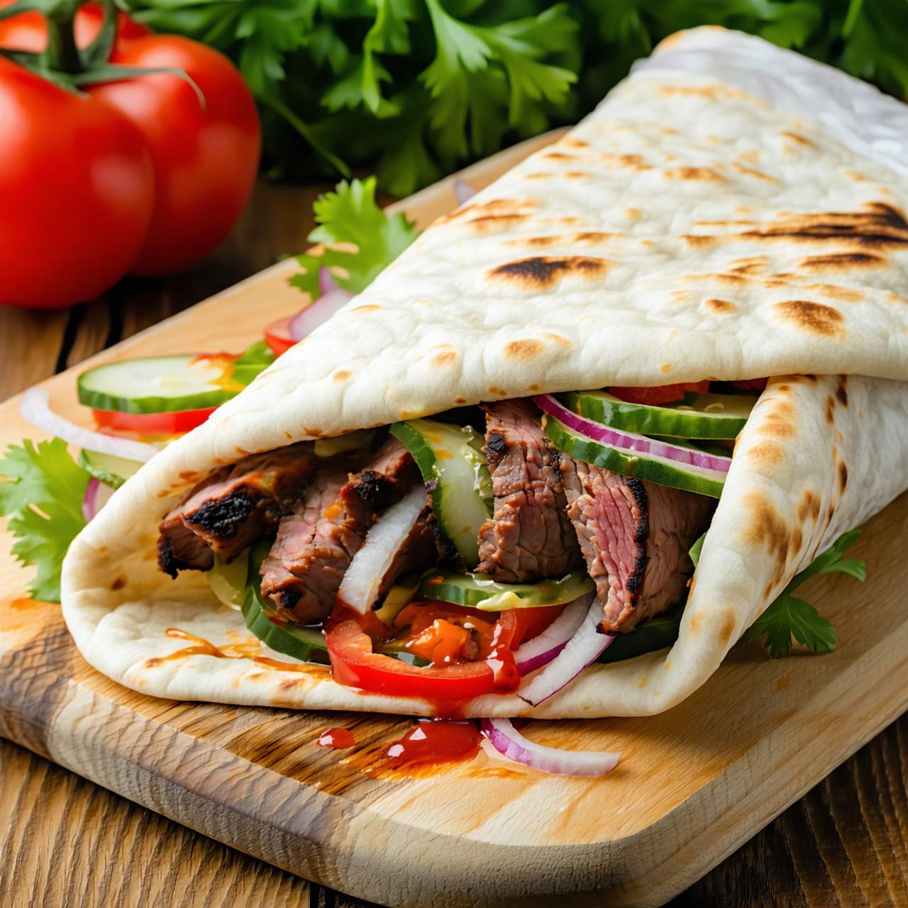 Pita roll z mięsem, marynatą, frytkami i sosem. Rozmiar, rodzaj mięsa i sos do wyboru; zdjęcie poglądowe