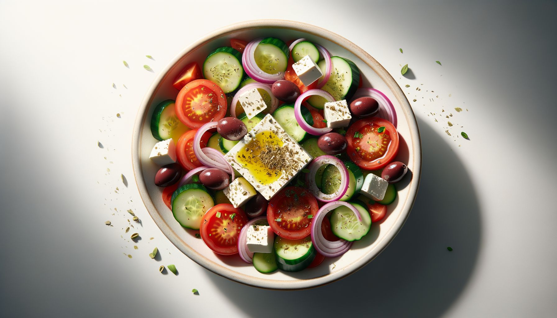 z oliwkami, czerwoną cebulą, warzywami (mix sałat, pomidory, ogórki, papryka) i sosem winegret