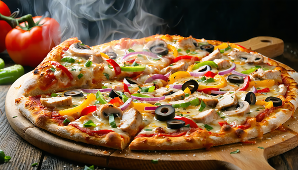Frango grelhado, cogumelos, cebola roxa, pimentos e azeitonas