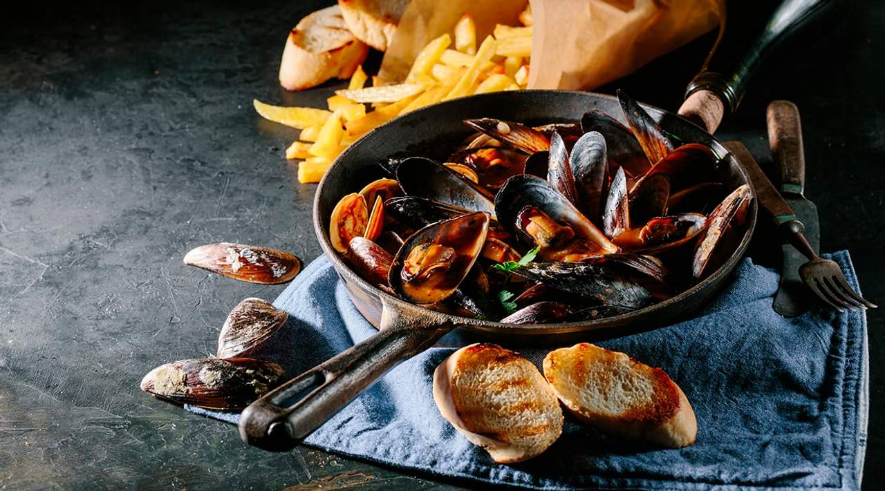 Midii proaspete (in cochilie) cu sos de rosii, patrunjel