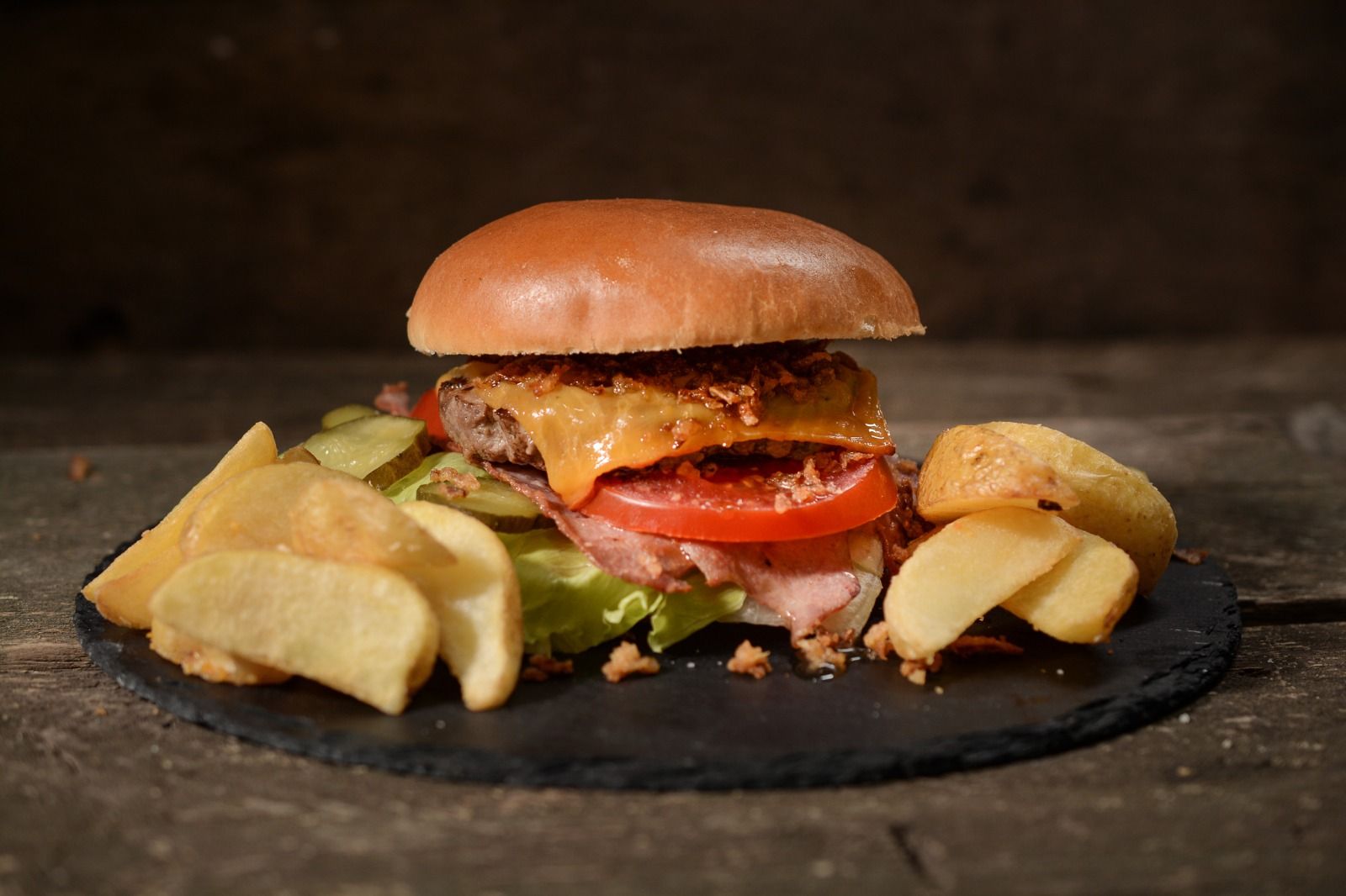 Chifla glazurata, carne vita, rosii, chedar felii, sala iceberg, bacon, ceapa caramelizata, castraveti murati, maioneza, mustar , ketchup, cartofi in coaja - 450g