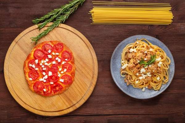 Penne 90g, ceapa 20g, usturoi, sos de rosii 120g, busuioc, oregano, parmezan 50g- 360g 628.47kcal, 16.58g grasimi (8.75g grasimi saturate), 88.64g carbohidrati (9.9g zaharuri), 33g proteine, 4.1g sare