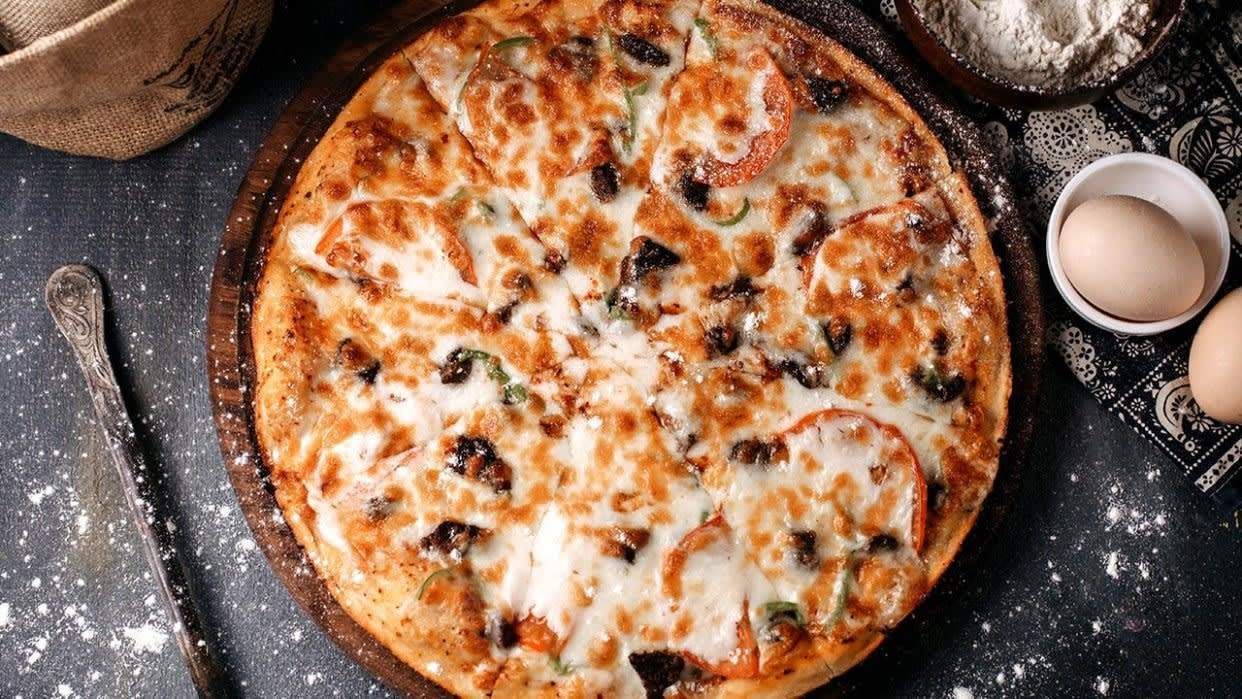 pelat, mocarela, šunka, pečurke / tomato sauce, cheese, ham, mushrooms