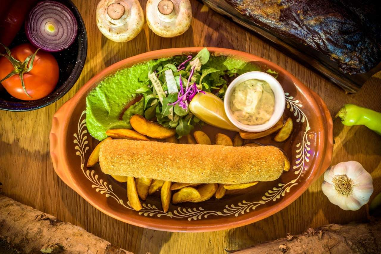 поховани свињски каре,пуњен качкаваљем и шункарицом,прилог помфрит и тартар сос