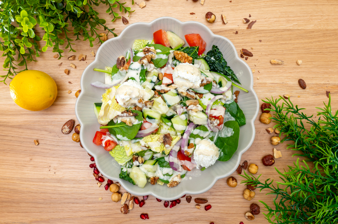 Mix zelenih salata, crveni kupus, grilovana paprika, krastavac, vlašac, orasi, kalamata masline, ranch dressing
