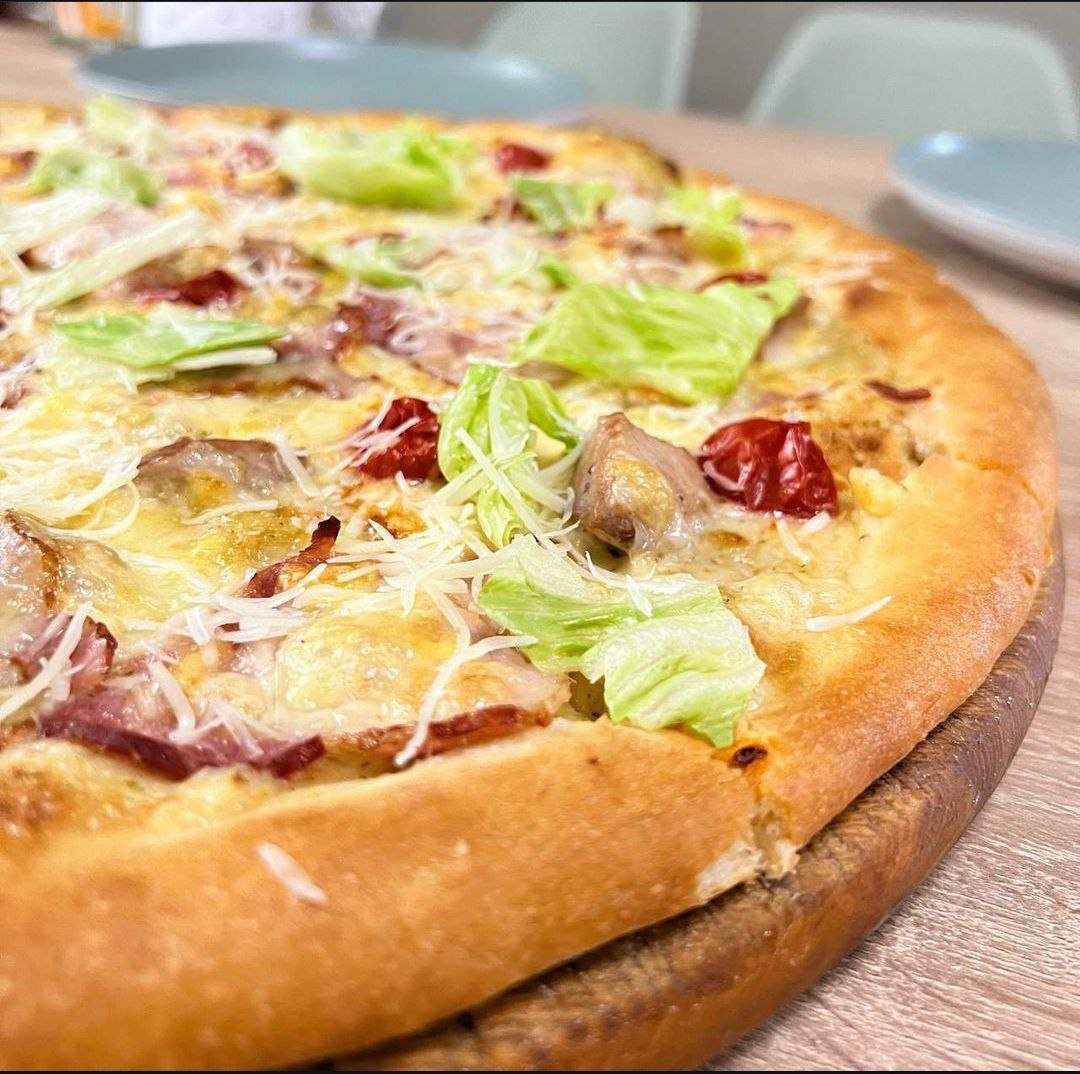 соус Цезар, моцарела, філе курки, бекон, пармезан, айсберг, помідори чері